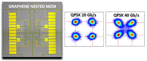 研究人员首次成功将基于石墨烯的I/Q调制器与硅光子学集成,实现了先进调制格式。具体而言,作者利用配备四个双层石墨烯电吸收调制器(EAM)的嵌套式马赫-曾德尔干涉仪(MZI),成功实现了高达40Gb/s速率的正交相移键控(QPSK)调制。该器件利用石墨烯的超快、宽带及节能特性实现高速大容量相干调制,为高数据速率光通信系统应用奠定基础。相关成果发表于《ACS Photonics》期刊。