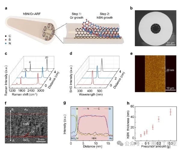图1. ARF基底上hBN/Gr异质结构的生长。(a)ARF上两步法生长hBN/Gr异质结构示意图。(b)hBN/Gr-ARF的截面SEM图像。(c)沿光纤轴向不同位置的hBN/Gr-ARF拉曼光谱。(d)沿光纤轴向不同位置的二次谐波(SHG)信号。(e)刻蚀ARF后hBN/Gr带的原子力显微镜(AFM)图像。(f)hBN/Gr-ARF的截面TEM图像,标注了ARF、石墨烯(Gr)、hBN和金(Au)保护层区域。(g)沿(f)图中白线从A点到B点的电子能量损失谱(EELS)线扫描分析。(h)hBN厚度随BH3NH3前驱体投料量的变化关系,误差棒表示标准偏差。