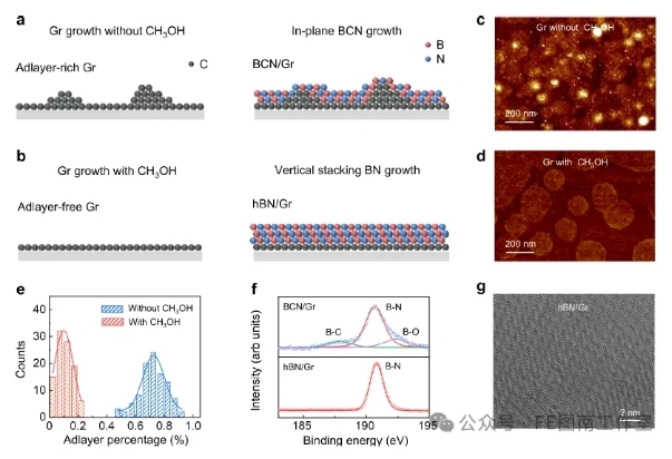 图2. ARF基底上hBN/Gr堆叠结构的调控。(a)BCN/Gr合成示意图:BN倾向于附着在石墨烯附加层边缘形成面内结构。(b)hBN/Gr合成示意图:BN在无附加层石墨烯上垂直堆叠。(c,d)未使用甲醇(c)和使用甲醇(d)处理的ARF表面石墨烯域原子力显微镜图像。(e)未处理(蓝线)与甲醇处理(红线)样品的石墨烯附加层百分比分布,每组采集100个数据点。(f)BCN/Gr-ARF(上图)和hBN/Gr-ARF(下图)的XPS B 1s能谱。(g)hBN/Gr的高分辨透射电子显微镜图像。