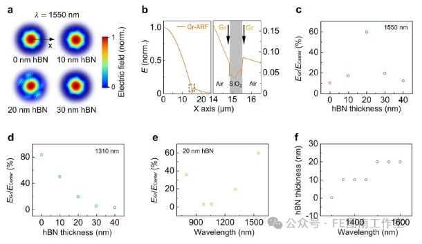 图3. hBN/Gr-ARF可调光学共振的模拟结果。(a)1550nm波长下hBN/Gr-ARF基模随hBN厚度变化的演化过程。(b)ARF上单层石墨烯沿X轴的归一化电场强度分布,外层与内层石墨烯的电场强度分别为纤芯中心的4.2%和4.5%,量化了沿光纤的光-石墨烯相互作用。(c)1550nm波长下,两个最内层石墨烯位置(如b所示)的总电场强度与纤芯中心强度比(EGr/ECenter)随hBN厚度的变化关系。(d)1310nm波长下EGr/ECenter随hBN厚度的变化。(e)20nm hBN厚度时不同激光波长下的EGr/ECenter,显示950-1100nm范围内相对强度较低,表明存在反共振区域。(f)最大EGr/ECenter对应的hBN厚度与波长关系曲线。