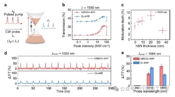 图4. 基于hBN/Gr-ARF的全光调制器。(a)基于石墨烯非线性光学调制的全光调制示意图,λ0和λ1分别表示脉冲泵浦光和连续探测光的波长。(b)hBN厚度约20nm的hBN/Gr-ARF与Gr-ARF的非线性光学调制曲线,实线为根据实验数据(圆圈)拟合的曲线。(c)1550nm波长下不同hBN厚度的hBN/Gr-ARF非线性光学调制深度。(d)在hBN厚度约20nm的hBN/Gr-ARF和Gr-ARF中,1064nm皮秒泵浦光作用下1550nm连续探测光的调制脉冲序列,ΔT表示透射率变化。(e)1064nm脉冲泵浦光作用下980、1310和1550nm连续探测光的全光调制性能,(c)和(e)中的误差棒表示标准偏差(N=3)。
