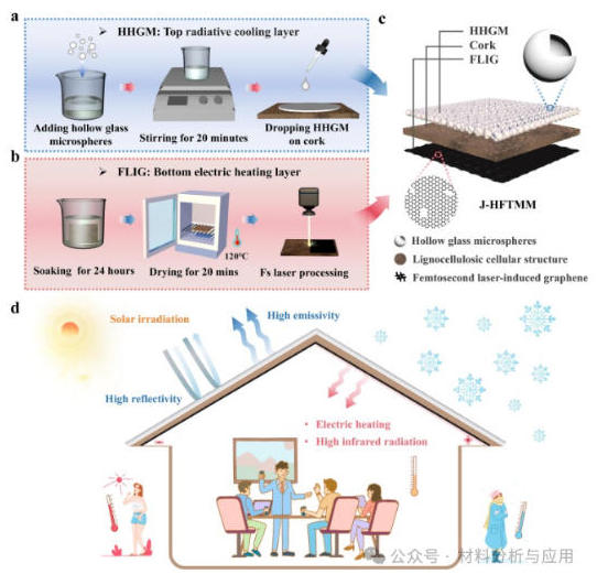 快速城市化显著增加了建筑能耗,其中热管理系统是主要驱动因素。本文,中南大学银恺 教授团队在《Chemical Engineering Journal》期刊发表名为“Dual-mode year-round efficient thermal management using radiative cooling and laser-induced graphene heating”的论文,研究提出一种双模式热管理材料——即Janus混合功能热管理材料(J-HFTMM)以应对这一挑战。该材料将堆叠中空玻璃微球(HHGM)构成的辐射冷却层与飞秒激光诱导石墨烯(FLIG)构成的电热加热层相结合。