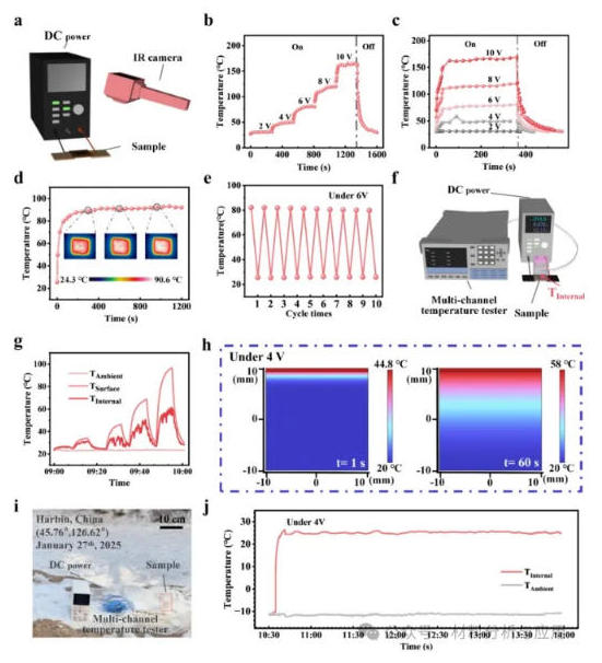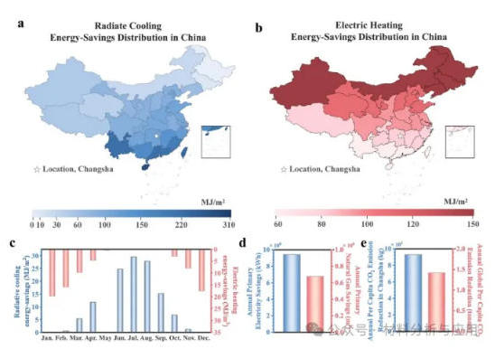 该创新材料无需机械翻转或相变即可无缝切换冷暖模式。电热效应可通过调节施加电压实现精准调控:HHGM层展现95%的中红外发射率与90.2%的太阳反射率,FLIG层则实现66Ω/sq的超低面电阻。户外测试表明,在夏季炎热、冬季寒冷的城市实际环境中,J-HFTMM制冷时可降低7.6℃,加热时可升温37.8℃。模拟数据显示其年节能潜力达209.5兆焦耳/平方米。这种双模材料为可持续建筑热管理提供了前景广阔的解决方案,可在不同气候区域实现显著节能效益,且无需复杂机械组件。