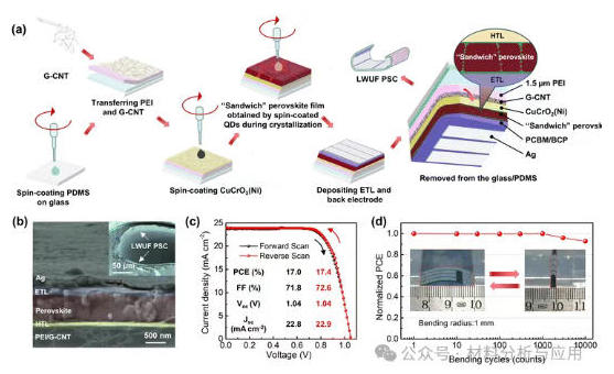 图1、 The process routes and the structural and performance characteristics of the LWUF PSCs. (a) Schematics of the fabrication procedure. (b) Cross-sectional SEM image of the LWUF PSC. The inset shows the SEM image of a LWUF PSC under bending with a curvature radius of 70 μm. (c) J–V curves of the device, recorded in reverse scanning and forward scanning. (d) Mechanical stability of the devices at a bending radius of 1 mm. The inset in (d) shows the digital image of a device under bending cycles.