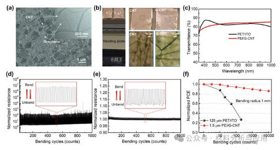 图2、 The microstructure of a G-CNT film and its advantages as a flexible electrode. (a) SEM image of a G-CNT film. The inset shows its HR-TEM image. (b) Moisture resistance investigation of CNT and G-CNT films. (c) Transmittance of PEI/G-CNT and PET/ITO electrode substrates. The dynamic resistances of PET/ITO (d) and PEI/G-CNT (e) electrode substrates in real time during bending cycles with a 1 mm bending radius. (f) Normalized PCE of FPSCs based on PET/ITO and PEI/G-CNT electrode substrates as a function of bending cycles with a bending radius of 1 mm.