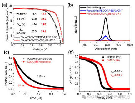 图3、Optimization of the device's efficiency using CuCrO2(Ni) nanoparticles. (a) J–V curves of the PSCs on rigid glass/G-CNT electrode substrates with different HTLs. (b) PL spectra. (c) TPC curves. (d) The Mott–Schottky analysis plot.
