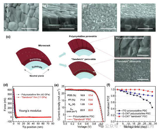 图4 Improvement of the device's performance by the as-designed “sandwich” perovskite architecture. The SEM images of the top and cross-section of the polycrystalline perovskite film (a and a′) and the “sandwich” perovskite film (b and b′). (c) Schematic representation of the relationship between the perovskite structure and the cracks generated during bending. The inset shows SEM images of two kinds of perovskite films after 1000 bending cycles at a curvature radius of 4 mm. (d) Young's modulus of polycrystalline and “sandwich” films. (e) J–V curves of LWUF PSCs. (f) Environmental stability of the PSCs. The scale bar is 1 μm.