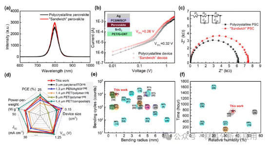 图5 Performance of LWUF PSCs based on polycrystalline and “sandwich” perovskite films. (a) PL spectra of perovskite films. (b) SCLC measurements. (c) Nyquist plots. The insets in (b) and (c) show the electron-only device's architecture and equivalent circuit model, respectively. (d) Comparison of the performance of the LWUF PSC in this work with that of FPSCs reported so far. (e) Mechanical stability of the FPSCs reported so far. (f) Environmental stability of the FPSCs reported so far. Light blue, magenta, gray, and saffron yellow bubbles in (e) and (f) represent ITO electrodes, Ag nanowire electrodes, carbon nanofilm electrodes, and composite electrode-based FPSCs in that order, and the percentages on the bubbles represent the retention rate of PCE after bending or aging.