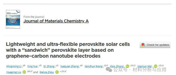 柔性钙钛矿太阳能电池(FPSCs)因在蓬勃发展的柔性电子学和便携设备领域具有巨大潜力,引发了广泛的研究热潮。尽管已有大量研究聚焦于FPSCs的性能、柔韧性及稳定性,但三者协同提升仍极具挑战。本文,中国科学院物理所周维亚 研究员在《J. Mater. Chem. A》期刊发表名为“Lightweight and ultra-flexible perovskite solar cells with a “sandwich” perovskite layer based on graphene–carbon nanotube electrodes”的论文,研究成功制备出兼具高性能与卓越稳定性的轻质超柔性钙钛矿太阳能电池(LWUF PSC)。