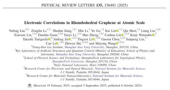 2025年10月6日,Phys. Rev. Lett.在线发表了上海交通大学王世勇教授、史志文教授、李灿博士和上海科技大学刘健鹏副教授课题组的研究论文,题目为《Electronic Correlations in Rhombohedral Graphene at Atomic Scale》,论文的第一作者为Yufeng Liu、Zonglin Li和Shudan Jiang。