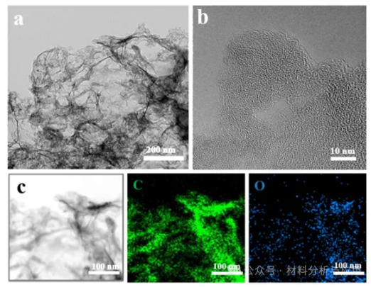 图3. (a) TEM image of PGC-K3Fe, (b) high-resolution TEM images of PGC-K3Fe, and (c) the element mapping images of C and O elements in PGC-K3Fe.