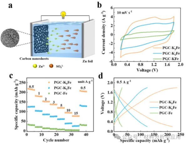 图4.(a) Schematic illustration of the PGC-based aqueous ZIHCs, (b) CV curves at 10 mV s–1, (c) rate capabilities, (d) GCD curves of PGC-K3Fe, PGC-K2Fe, and PGC-Fe based ZIHCs devices.