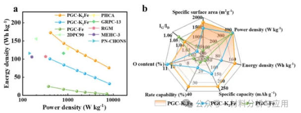 图5. (a) Ragone plots of PGC-K3Fe, PGC-K2Fe, PGC-Fe and other reported carbon-based ZIHCs, and (b) Radar chart for comparison of all obtained samples in this work.