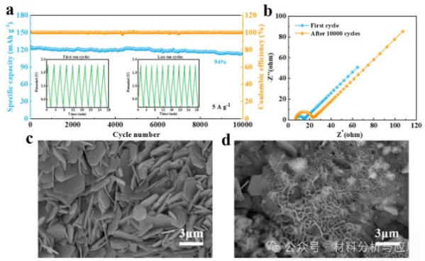 图6、(a) Cycling stability and coulombic efficiency of assembled PGC-K3Fe-based aqueous ZIHCs for 10000 cycles at 5 A g?1, (b) Nyquist plots before and after 10000 cycles, SEM images of (c) Zn anode and (d) carbon cathode after long-term cycles.