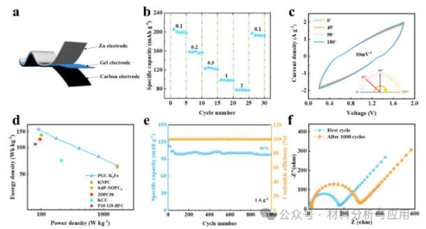 图7、The flexible solid-state ZIHCs based on PGC-K3Fe: (a) schematic illustration structure, (b) rate capability at various current densities, (c) CV curves at 10 m V?1 measured at varying bending angles, (d) Ragone plots compared with other reported carbon-based flexible ZIHCs, (e) long-term cycling performance for 1000 cycles at 1 A g?1, and (f) the Nyquist plots of before and after 1000 cycles.