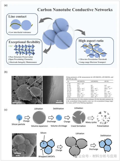 图2、a) CNT conductive network and its characteristic advantages. b) SEM image of CNT conductive network with corresponding fitted EIS data of the electrode (Reproduced with permission.Copyright 2024, Elsevier). c) Schematic illustration of the mechanism for maintaining electrode structural integrity by CNTs (Reproduced with permission。