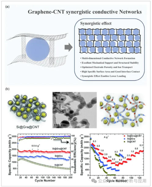 图3、a)石墨烯-碳纳米管协同导电网络及其特征优势。b) 石墨烯-CNT杂化导电网络示意图、TEM表征及相应性能对比。