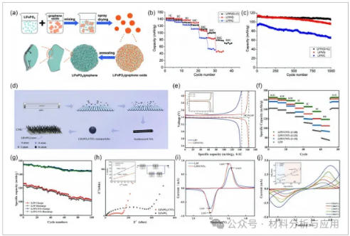 图4、a) The preparation process and the microscale structure of LFP/graphene composite. b) Comparison of rate capability of LFP/G, LFP/C, and LFP/(G?+?C). c) Comparative cycling performances of LFP/G, LFP/C, and LFP/(G?+?C) operated under 10?C charging and 20?C discharging (Reproduced with permission. Copyright 2011, RSC). d) The synthesis process for the LiFePO4/CNTs nanocomposites. e) The initial charge/discharge curves and rate capabilities of the LiFePO4/CNTs composites electrodes with different C2H4/H2 proportions. f) Rate capabilities and cycling stabilities of LiFePO4 and LiFePO4/CNTs composites at different rates (0.1, 0.2, 0.5, 1, 2, 5, and 10?C). g) Long-term stability of LiFePO4 and LiFePO4/CNTs composites at 1?C. h) Electrochemical impedance plots of LiFePO4 and LiFePO4/CNTs composites from 105 to 0.01?Hz and equivalent circuit. i) Cyclic voltammetry curves of the LiFePO4 and LiFePO4/CNTs composites at a scan rate of 0.2?mV s?1. j) Cyclic voltammetry curves of the LiFePO4/CNTs composites at different scan rates from 0.5 to 3.0?mV?s?1 (Reproduced with permission.[110] Copyright 2025, Elsevier).