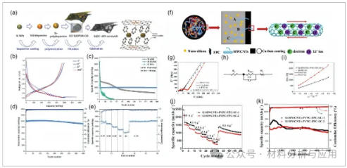 图5、a) The synthetic procedure of the sandwich-structured Si@C-rGO composite. b) Voltage profiles for different cycles. c) Cycling stabilities of Si@C-rGO, Si-rGO, and pristine Si NPs at a current density of 300?mA?g?1. d) Capacity and Coulombic efficiency of Si@C-rGO for 400 cycles. e) Marked charge/discharge capacities at various rates (Reproduced with permission.[138] Copyright 2016, Wiley). f) Schematic illustration of three kind of states of MWCNTs through the SC layer and the transfer behavior of electron and Li ion. g) EIS of Si-MWCNTs-PVPC-FPC-SC-1 and Si-FPC-SC electrode materials. h) Equivalent circuit used to model EIS data for electrode materials. i) Relationship of the Z+re and ω?1/2 of the Si-MWCNTs-PVPC-FPC-SC-1 and Si-FPC-SC. j) Rate capability of Si-MWCNTs-PVPCFPC-SC-1 and Si-MWCNTs-PVPC-FPC-SC-2. k) Long-term cycling performance of Si-MWCNTs-PVPC-FPC-SC-1 and Si-MWCNTs-PVPC-FPC-SC-2 electrode at 1?A?g?1