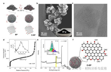图1. Synthetic procedure and characterization of O-BP. (a) Schematic illustrating the fabrication of O-BP via annealing. SEM (b) and TEM (c) images of O-BP nanoparticles. (d) N2 adsorption–desorption isotherm and pore-size distribution (inset) of O-BP. (e) XPS survey spectrum and high-resolution O 1s XPS spectrum (inset) of O-BP. (f) Proposed oxygenation structure of the O-BP graphitic plane.