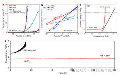 图2. CER performance. (a) LSV curves of O-BP, BP, commercial RuO2, and graphite rod in 4 M NaCl (pH = 1) at a scanning rate of 5 mV s–1. (b) Tafel plots of O-BP, RuO2, and BP. (c) CV curves of O-BP. Black line: without correction; red line: with 95% iR correction. (d) Chronopotentiograms of O-BP and graphite rod in 4.0 M NaCl (pH = 1) at a current density of 0.5 A cm–2. O-BP, BP, and commercial RuO2 are supported on carbon paper with a loading density of 2 mg cm–2.