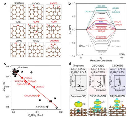 图3. CER activities of different oxygen functional groups. (a) Structural models of oxygen-containing sites on edges of monolayer armchair chrysene graphene and zigzag tetracene graphene examined in this study. Golden, red, and white circle represent carbon, oxygen, and hydrogen atoms, respectively. (b) CER free energy diagrams of representative sites in oxygenated carbon and RuO2 at zero overpotential. (c) Relationship between ΔG*Cl and Dpz@EF. (d) PDOS of pz around the Fermi level and charge density difference of graphene, C5/C=OZG and C5/OHZG with the adsorbed *Cl. Cyan stands for holes and yellow for electrons. The isosurfaces are taken as 0.005e per Bohr。
