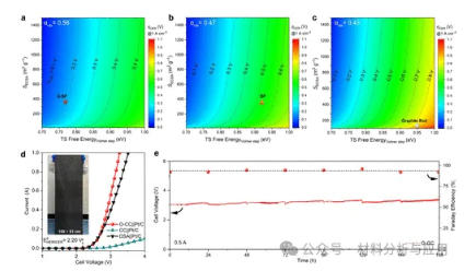 图4. Effect of intrinsic and extrinsic properties of O-BP on CER performance and O–CC-catalyzed CER under industry operating current densities. (a–c) Theoretical trends of CER overpotential under 1 A cm–2 with variation in electrochemically active surface area and TS free energy of catalysts for given α of 0.58 (a, O-BP), 0.47 (b, BP), and 0.43 (c, graphite rod), respectively. (d) LSV curves recorded from chlor-alkali cells assembled using O–CC, CC, and commercial DSA, respectively, as the anode and 20 wt % Pt/C (supported on carbon paper) as the cathode at room temperature in 4.0 M NaCl (pH = 1) anolyte and 6 M NaOH catholyte. Electrode area: 1 × 1 cm2; inset: photograph of O–CC. (e) Chronopotentiogram and corresponding Faradaic efficiency of O–CC∥Pt/C chlor-alkali cell at 0.5 A.