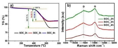 图2. (a) TGA and (b) Raman curves of SOC composites.