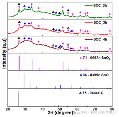 图3. Powder XRD patterns of SOC composites and reference peaks of SnO, SnO2, and C.