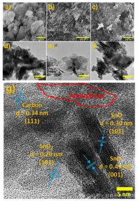图4. (a–c) SEM and (d–f) TEM images of SOC_2h, SOC_3h, and SOC_4h samples, respectively. (g) HRTEM of the SOC_3h sample.