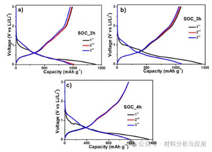图5. Voltage profile curves of (a) SOC_2h, (b) SOC_3h, and (c) SOC_4h electrodes at 0.1 A g–1 in the first three cycles.