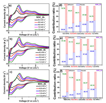 图6. (a–c) CV curves and (d–f) contribution ratios of diffusive and pseudo for the SOC_2h, SOC_3h, and SOC_4h electrodes at different scan rates.