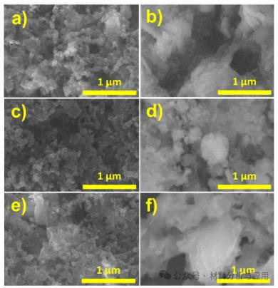 图7. SEM images before and after cycling of materials (a,b) SOC_2h, (c,d) SOC_3h, and (e,f) SOC_4h.