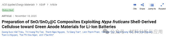 本文,越南芹苴大学To Giang Tran等在《ACS Appl. Energy Mater》期刊发表名为“Preparation of SnO/SnO2@C Composites Exploiting Nypa fruticans Shell-Derived Cellulose toward Green Anode Materials for Li-Ion Batteries”的论文,研究提出一种简便方法,采用水热法制备由水椰子壳(SOC)衍生的SnO、SnO?与碳组成的复合材料。