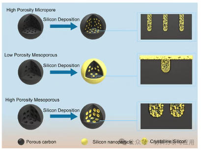 图3. Schematic of silicon deposition behavior in a carbon host with differential porosity.