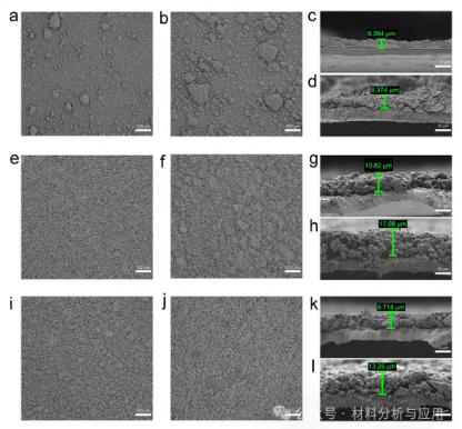 图5. (a, e, i) Top-view SEM images of the C@Si@ZTC, C@Si@CMK-3, and C@Si@OMC-8 electrodes before and (b, f, j) after 200 cycles. (c, g, k) Cross-sectional SEM images of the C@Si@ZTC, C@Si@CMK-3, and C@Si@OMC-8 electrodes before and (d, h, l) after 200 cycles with fully charged (delithiated) state.