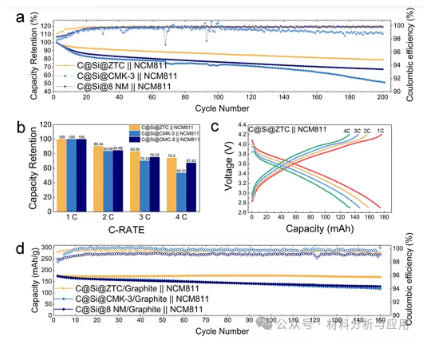 图6. (a) Cyclic performances of C@Si@ZTC||NCM811, C@Si@CMK-3||NCM811, and C@Si@OMC-8||NCM811 full cells at 1C. (b) Comparison of the rate performances of the three full cells. (c) Voltage profiles of the C@Si@ZTC||NCM811 full cell in the range of 1C to 4C. (d) Cyclic performance of C@Si@ZTC/Graphite||NCM811, C@Si@CMK-3/Graphite||NCM811, and C@Si@OMC-8/Graphite||NCM811 full cells at 1C.