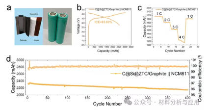 图7. Electrochemical performance of C@Si@ZTC/Graphite|NCM811 cylindrical 18650 batteries. (a) Schematic illustration and digital image of cylindrical 18650 batteries. (b) Initial voltage profiles at 0.1C, (c) rate capability, and (d) cycling performance at 1C.