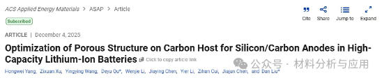 硅(Si)作为高能量密度锂离子电池(LIBs)最具前景的负极材料之一,因其在循环过程中体积变化显著而面临商业化挑战。将非晶硅纳米颗粒(SiNP)嵌入多孔碳基体已成为缓解此问题的有效策略,特别是通过近期开发的以硅烷为前驱体的化学气相沉积(CVD)途径。碳骨架的结构特性——如孔径、孔体积和比表面积——至关重要。本文,武汉理工大学屈德宇 教授、刘丹 副教授等在《ACS Appl. Energy Mater 》期刊发表名为“Optimization of Porous Structure on Carbon Host for Silicon/Carbon Anodes in High-Capacity Lithium-Ion Batteries”的论文,研究采用三种模型碳载体:具有单分散微孔的沸石模板碳(ZTC)、均匀分布4.9纳米介孔的CMK-3,以及具有单分散8.3纳米介孔的有序介孔碳(OMC-8)。系统研究了碳载体的多孔结构对硅/碳(Si/C)负极性能的影响。