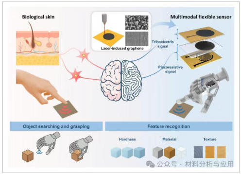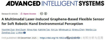 人类皮肤具有复杂的分层结构,其上分布着多样化的感觉受体,使我们在与环境交互时能够感知丰富的多模态信息。这种生物学范式启发了先进多模态柔性传感器和智能机器人系统的研发。本文,北京航空航天大学文力 教授等在《ADVANCED INTELLIGENT SYSTEMS》期刊发表名为“A Multimodal Laser-Induced Graphene-Based Flexible Sensor for Soft Robotic Hand Environmental Perception”的论文,研究提出提出一种基于激光诱导石墨烯(LIG)的新型多模态柔性传感器(MLFS),通过激光加工技术快速制备具有可调特性的LIG功能层。通过整合摩擦电与压阻机制,该柔性传感器可全面检测邻近及接触刺激,提供灵敏可靠的环境反馈。