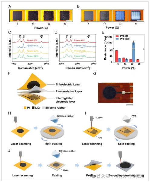 图2、Design and fabrication of the MLFS. A) Optical image of LIG pattern at PPI?=?500 under different laser power conditions. Scale bar: 5?mm. B) Optical image of LIG pattern at PPI?=?1000 under different laser power conditions. Scale bar: 5?mm. C) Raman spectra of LIG fabricated at PPI?=?500 under different laser parameters. D) Raman spectra of LIG fabricated at PPI?=?1000 under different laser parameters. E) Sheet resistance of LIG under different PPI and laser power. F) 3D schematic illustration of the MLFS structure, consisting of triboelectric, piezoresistive, and interdigitated electrode layers. G) Photograph of the fabricated MLFS. Scale bar: 5?mm. H) Fabrication process of the triboelectric layer. I) Fabrication process of the interdigitated electrode layer. J) Fabrication of the piezoresistive layer.