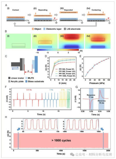 图3、Mechanism and performance of single electrode triboelectric sensing in the case of vertical contact-separation. A) Working principle of the triboelectric sensing layer for proximity and contact detection in the case of vertical contact-separation. B) Potential distribution of COMSOL simulation results in the case of vertical contact-separation. C) Schematic of the test setup used for triboelectric sensing characterization. D) Open-circuit voltage output versus distance curve of triboelectric sensing. E) Sensor output voltage under varying contact pressures up to 100?kPa. F) Short-circuit current response under different loading frequencies. G) Response and recovery time of the triboelectric sensing under fast tapping. H) Cyclic durability test of the triboelectric sensing under repeated loading. Error bars represent standard deviation, n?=?5 independent replicates.