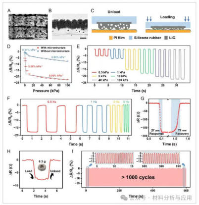 图4、Mechanism and performance of piezoresistive sensing. A) Surface SEM image of piezoresistive layer with laser-engraved microstructures. Scale bar: 500?μm. B) Cross-sectional microscopic image showing the bump structure from secondary laser engraving. Scale bar: 500?μm. C) Working principle of the piezoresistive sensing mechanism under pressure. D) Comparison of resistance-pressure response with and without microstructures. E) Resistance response under different pressures. F) Dynamic response of the piezoresistive sensing under varying frequency loads. G) Response and recovery times of the piezoresistive sensing. H) Demonstration of ultra-low force detection using a 0.3?g metal nut. I) Cyclic durability of the piezoresistive signal under 10?kPa repeated loading. Error bars represent standard deviation, n?=?5 independent replicates.