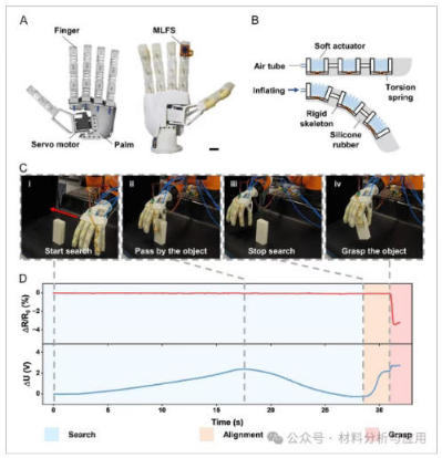 图5、Soft robotic hand searching and grasping integrated with the MLFS. A) Design of the soft robotic hand with five fingers and six degrees of freedom. Scale bar: 20?mm. B) Structure and actuation mechanism of the soft robotic finger. C) Workflow of autonomous object searching and grasping using MLFS signals. D) Sensor signals during the process. The process is divided into three stages—search, alignment, and grasp.