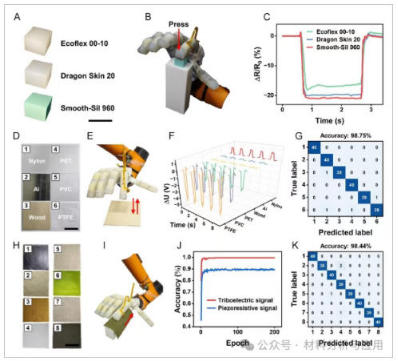 图6、Soft robotic hand integrated with the MLFS detecting different object properties. A) Silicone blocks made of different hardness silicone materials. Scale bar: 20?mm. B) Experimental setup for hardness discrimination using silicone blocks. C) Sensor response for hardness discrimination using silicone blocks. D) Six materials used for material classification experiments. Scale bar: 50?mm. E) Experimental setup for material classification. F) Triboelectric voltage waveforms from five repeated trials. G) Confusion matrix of CNN-based material classification results (accuracy: 98.75%). H) Eight types of cloth used for texture classification experiments. Scale bar: 50?mm. I) Experimental setup for texture classification. J) Comparison of accuracy rates on the validation set using different signals. K) Confusion matrix of CNN-based texture classification results (accuracy: 98.44%).