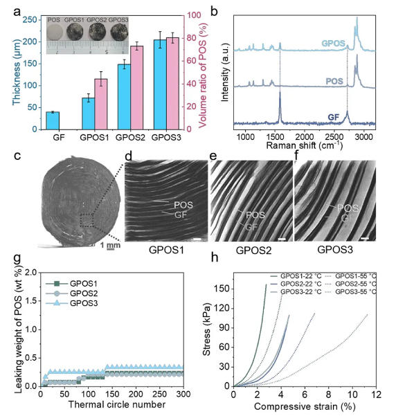 图2.展示了GPOS的结构与力学性能表征结果。(a) 滚压前POS包覆的垂直石墨片(VG)层压复合材料的厚度及GPOS中POS的体积比,插图为POS与GPOS的实物照片;(b) GF、POS与GPOS2的拉曼光谱;(c)-(f) 三维X射线断层扫描图像,其中(c)为GPOS1的整体形貌,(d)-(f)分别为GPOS1、GPOS2和GPOS3的放大视图(比例尺:100 μm);(g) GPOS在300次熔融/冷冻循环中的泄漏质量变化;(h) GPOS在22°C和55°C下的压缩应变-应力曲线。