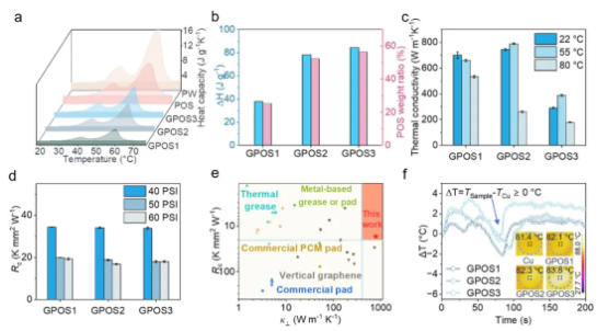 图3.展示了GPOS样品的热物理性能表征结果。(a) PW、POS及GPOS的DSC曲线;(b) GPOS的熔融焓及计算得出的POS重量比例;(c) 压缩应力下GPOS的垂直导热系数κ⊥;(d) GPOS的接触热阻Rc在22°C、55°C及80°C下的对比;(e) 55°C下GPOS2的κ⊥和Rc与已报道及商业化热界面材料的性能比较;(f) GPOS与铜表面温差随加热时间的变化关系,插图为加热200秒后GPOS与铜的红外热像图。