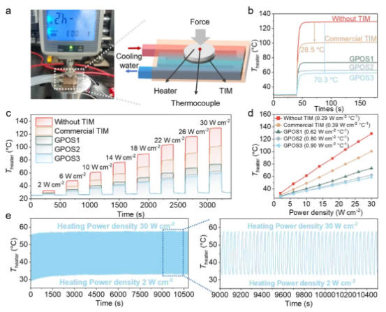 图5.展示了GPOS的散热性能。(a) 散热评估的实验装置与结构示意图;(b) 在30 W·cm?2输入功率下加热器温度随时间的变化曲线;(c) 输入功率密度从2到30 W·cm?2变化时的稳态加热器温度响应;(d) 加热器温度随功率密度的变化关系;(e) GPOS3的热循环稳定性测试结果。