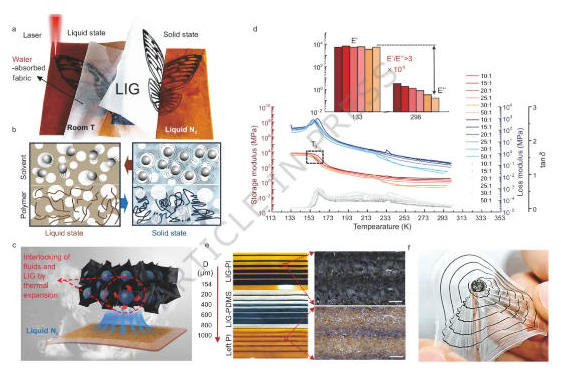 a,显示在液氮中将LIG转移到吸水无纺布上的数码照片。b,示意图,分别描绘了溶剂或未固化聚合物在室温和液氮温度下的液态和固态。c,由于热膨胀效应,多孔LIG和PDMS之间形成的互锁结构的示意图。d,在133 K至298 K温度范围内测量的不同比例PDMS弹性体的动态模量和转变温度。插图显示了不同组成的PDMS在133 K和298 K下的杨氏模量比。e,原始PI上的LIG图案、转移到PDMS上的LIG以及去除LIG后剩余PI的照片,具有不同的线宽和相应的光学图像。f,照片显示超薄LIG/PDMS复合材料可以很容易地在玻璃棒上通过按压和扭曲变形。比例尺:50 μm。