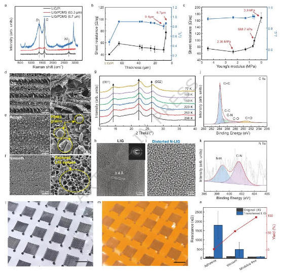 a,原始PI上的LIG、通过真空辅助转移嵌入到相对较厚的PDMS中的LIG以及通过低温转移部分嵌入到相对较薄的PDMS中的LIG的拉曼光谱。原始PI上的LIG和转移到PDMS上的LIG的薄层电阻和石墨化质量(ID/IG)分别作为PDMS (b)厚度和(c)模量的函数,在液氮下测量。数据以平均值±标准差表示,n=3。d-f,原始LIG、通过真空辅助转移到较厚(63.3 μm)PDMS上的LIG以及通过低温转移到较薄(6.7 μm)PDMS上的LIG的SEM图像。g,不同温度下原始LIG的XRD结果。h-i,在乙醇中剥离后,低温处理前后LIG的晶体和无序石墨烯层的高分辨率球差校正透射电子显微镜(SAC-TEM)图像。观察到剥离后的原始LIG具有典型的石墨烯层间距(3.4 ?)。j-k,通过XPS确定的低温处理后LIG中碳(C)和氮(N)的化学状态分析。 l-m,转移到PDMS上的LIG微线图案(l)以及低温转移后剩余的PI基底(m)的照片。n,LIG微线图案转移前后的转移良率和电阻变化。比例尺:1 cm。数据以平均值±标准差表示,n=100。